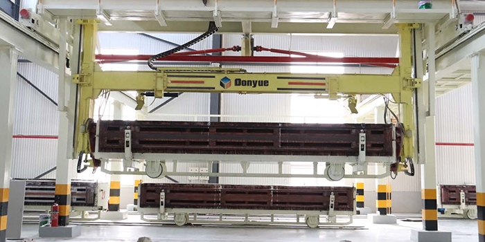 空翻脫模機用于抓取模箱翻轉 90°,側立在切割小車上進行切割;由行走部分與吊具組成,吊具升降、開鎖及翻轉均采用液壓驅動;模具開鎖采用液壓缸直開式結構,鎖緊臂旋轉 90°,具有開合迅速穩(wěn)定等特點;模具抓鉤采用直抓式結構,具有液壓鎖定及機械自鎖,確保吊運的安全。